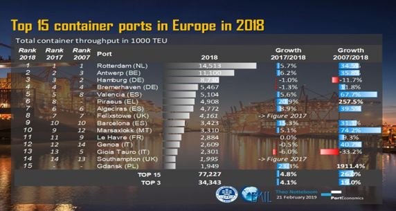 «Είναι ραγδαία η άνοδός του στην παγκόσμια κατάταξη λιμένων (από τη 93η στη 36η θέση). Η διακίνηση των εμπορευματοκιβωτίων το 2019 θα ξεπεράσει τα 5 εκ. TEU και καλώς εχόντων των πραγμάτων ο Πειραιάς θα γίνει το μεγαλύτερο λιμάνι της Μεσογείου. Ήδη για το πρώτο τρίμηνο του 2019 έχει σημειωθεί νέο ρεκόρ διακίνησης στους προβλήτες εμπορευματοκιβωτίων, καθώς και οι τρεις μαζί αθροιστικά ξεπέρασαν τα 1,33 εκατ. TEU».
