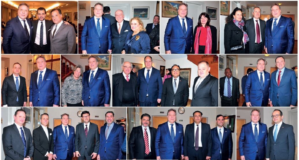 First row: CCG President and Hnry Consul of Dominica Christos Vardikos with Hnry Consul of Monaco and Athens Medical Group CEO Dr. Vasilis Apostolopoulos and Minister of Health Adonis Georgiadis; with MoFA B Director General Ambassador and Mrs. Constantinos Piperigos; with MoFA A8 Director Ambassador Argyro Papoulia; with MoFA A7 Director Ambassador and Mrs. Loucas Karatsolis. Second row: with MoFA Deputy Chief of Protocol Nikos Fouyas; with Marina Hourmouzi (MoFA); the Ambassadors of Cuba Aramis Hernandez, Palestine Yussef Dorkhom, the Philippines Giovanni Palec and Hnry Consul of Papua New Guinea Nick Roniotis; with the Ambassador of Georgia Levan Beridze. Third row: with Andreas Kakkos (Hellenic Police), Hnry Consul of Moldova Georges Palazis, Moldovan Ambassador Andei Popov and George Triantafyllou (Star Automotive Hellas); with Hnry Consul of the Seychelles Loucas Ellinas, Ambassador of Pakistan Muhammad Qureshi and Hnry Consul of Malaysia Savvas Tzanis; with Charge d’Affaires of Lebanon Francis Marwan. Fourth row: with the Deputy Head of Mission of Kuwait Abdullah Alothinah; with EENE Director General Pavlos Efthyimou and Deputy Minister Chatzivasileiou; with the Hnry Consuls of Botswana Nectarios Polychroniou, of Uruguay, of Namibia, of Romania Konstantinos Kourkounakis and of Hungary Periandros Epitropakis. Fifth row: with the Hnry Consuls of Moldova, Kenya and of Brazil Dr. Ioannis Lyras; of Oman Georgios Moundreas; of El Salvador Dr. Panagiotis Koutsikos and of Luxembourg Artemis Papatheodorou; of South Africa and Mrs. Vassilios Takas.
