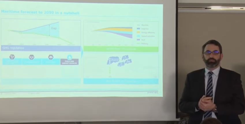 George Teriakidis, Area Manager Eastern Mediterranean & Black Sea, presented the Maritime Forecast to 2050, a part of the Energy Transition Outlook (ETO) report, produced by DNV GL. This report provides guidance regarding the environmental challenges ahead, highlights major trends, and offers insights on the rapidly changing global energy landscape. The heart of this study is the alternative strategies and pathways the world fleet and industry could take towards decarbonization.