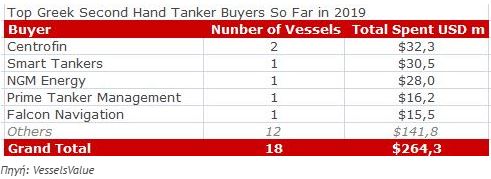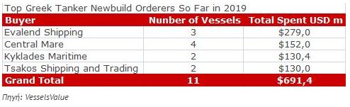 Ελληνικών συμφερόντων ναυτιλιακές εταιρείες έχουν επενδύσει σχεδόν 1 δις δολάρια τους πρώτους μήνες του 2019 για την αγορά δεξαμενόπλοιων.