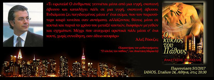 Ο συγγραφέας Αναστάσης Μαρασλής μέσα από το νέο του βιβλίο, το μυθιστόρημα ‘Ο κύκλος του Πάθους’, κάνει μια βαθιά διεισδυτική αποτύπωση του ρηχού και αδιέξοδου κόσμου της ύλης, για να μοιραστεί αλήθειες που προσφέρονται στους αναγνώστες ως τεκμήρια των επιγνώσεών του.