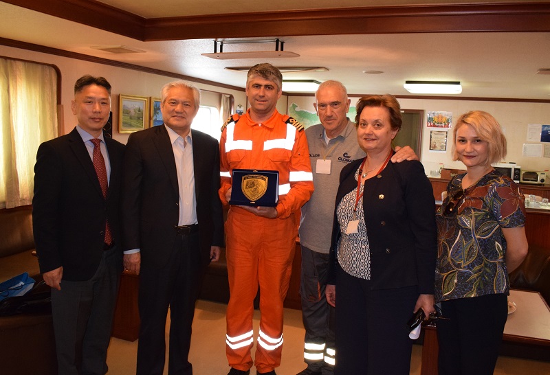 | Από αριστερά προς δεξιά: ο κ. CHEN YUPING, Manager Operation Dept. ΟΛΠ Α.Ε., ο Captain FU CHENGQIU, Δ/νων Σύμβουλος ΟΛΠ Α.Ε., ο Πλοίαρχος Capt. KALIN DIMOV, ο κ. ΑΝΤΩΝΗΣ ΔΟΥΚΑΣ Δ/νων Σύμβουλος της GLOBAL MARITIME, η κα ΠΑΡΑΣΚΕΥΗ ΚΑΛΑΜΑΡΑ, Προϊσταμένη του RO-RO TERMINAL ΟΛΠ Α.Ε. και η κα ΠΑΤΡΙΤΣΙΑ ΖΗΓΟΥ, Επίκουρος Προϊσταμένου του RO-RO TERMINAL ΟΛΠ Α.Ε. |