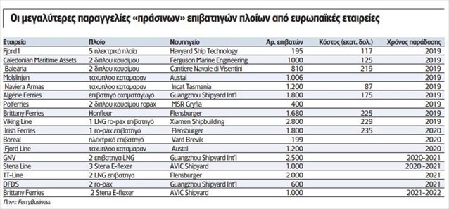 Σύμφωνα με στοιχεία που παρουσιάζει η «Ν», περισσότερα από 25 επιβατηγά οχηματαγωγά πλοία ναυπηγούνται αυτή την περίοδο από αρκετές ευρωπαϊκές ακτοπλοϊκές εταιρείες με ορίζοντα παράδοσης το 2022, κύριο χαρακτηριστικό των οποίων είναι οι μειωμένες μέχρι και μηδενικές εκπομπές ρύπων, καθώς πρόκειται για πλοία που χρησιμοποιούν ως καύσιμο είτε υγροποιημένο φυσικό αέριο (LNG) είτε άλλα εναλλακτικά καύσιμα από μπαταρίες μέχρι και υδρογόνο.